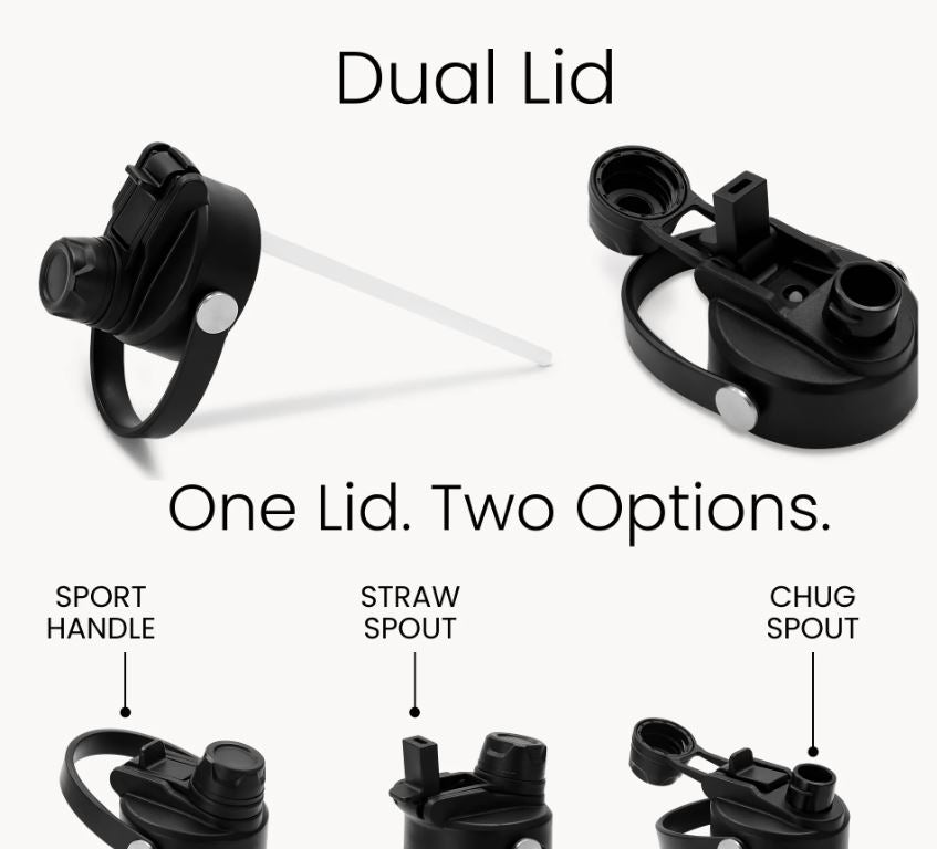 MakerFlo's sporty 32oz water bottle features a Dual 2-in-1 Lid Design. One side has a straw spout, the other side is an open chug spout and it also has a sturdy carrying handle. This lid fits all MakerFlo 18oz and 32oz water bottles.